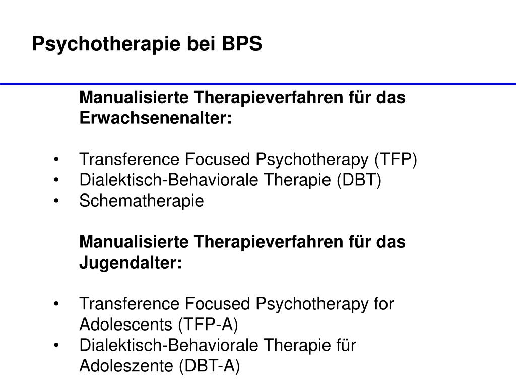 Psychotherapie bei BPS • Manualisierte Therapieverfahren für das Erwachsenenalter: • Transference Focused Psychotherapy (TFP) • Dialektisch-Behaviorale Therapie (DBT) • Schematherapie • Manualisierte Therapieverfahren für das Jugendalter: • Transference Focused Psychotherapy for Adolescents (TFP-A) • Dialektisch-Behaviorale Therapie für Adoleszente (DBT-A)