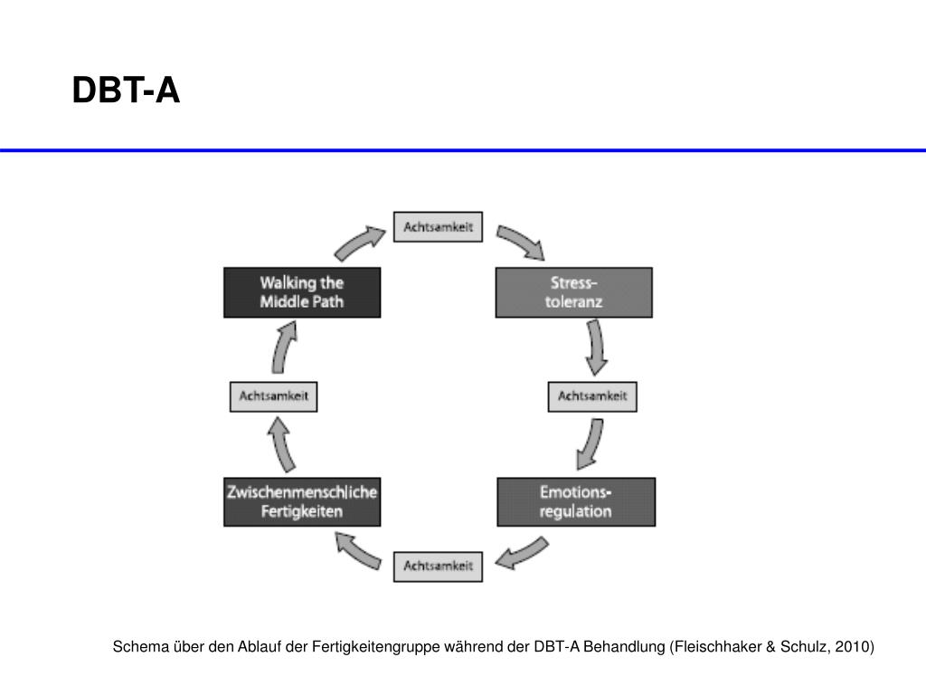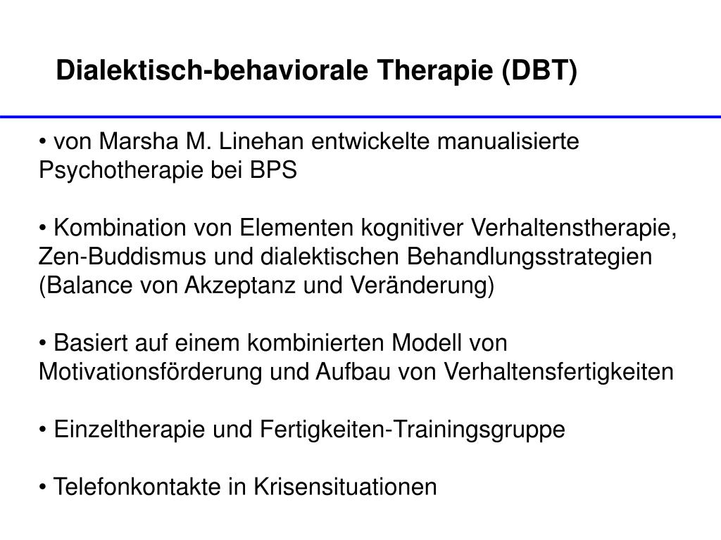Dialektisch-behaviorale Therapie (DBT) • • von Marsha M. Linehan entwickelte manualisierte Psychotherapie bei BPS • Kombination von Elementen kognitiver Verhaltenstherapie, Zen-Buddismus und dialektischen Behandlungsstrategien (Balance von Akzeptanz und Veränderung) • Basiert auf einem kombinierten Modell von Motivationsförderung und Aufbau von Verhaltensfertigkeiten • Einzeltherapie und Fertigkeiten-Trainingsgruppe • Telefonkontakte in Krisensituationen