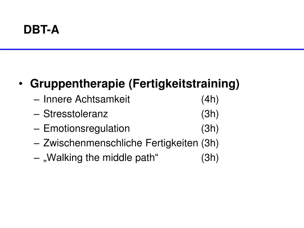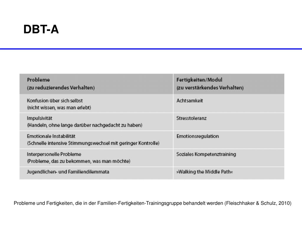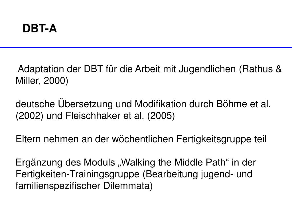 DBT-A • Adaptation der DBT für die Arbeit mit Jugendlichen (Rathus & Miller, 2000) • deutsche Übersetzung und Modifikation durch Böhme et al. (2002) und Fleischhaker et al. (2005) • Eltern nehmen an der wöchentlichen Fertigkeitsgruppe teil • Ergänzung des Moduls „Walking the Middle Path“ in der Fertigkeiten-Trainingsgruppe (Bearbeitung jugend- und familienspezifischer Dilemmata)
