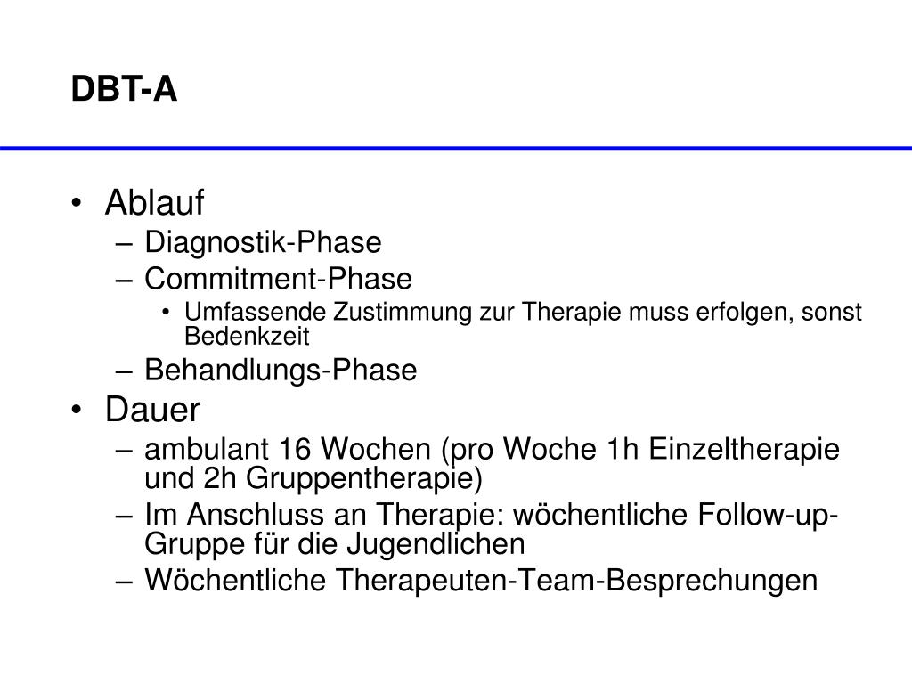 DBT-A • Ablauf • Diagnostik-Phase • Commitment-Phase • Umfassende Zustimmung zur Therapie muss erfolgen, sonst Bedenkzeit • Behandlungs-Phase • Dauer • ambulant 16 Wochen (pro Woche 1h Einzeltherapie und 2h Gruppentherapie) • Im Anschluss an Therapie: wöchentliche Follow-up-Gruppe für die Jugendlichen • Wöchentliche Therapeuten-Team-Besprechungen