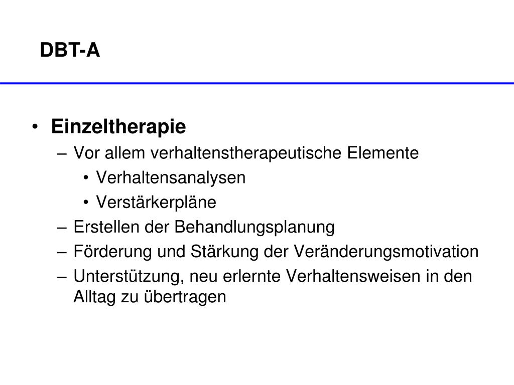 DBT-A • Einzeltherapie • Vor allem verhaltenstherapeutische Elemente • Verhaltensanalysen • Verstärkerpläne • Erstellen der Behandlungsplanung • Förderung und Stärkung der Veränderungsmotivation • Unterstützung, neu erlernte Verhaltensweisen in den Alltag zu übertragen