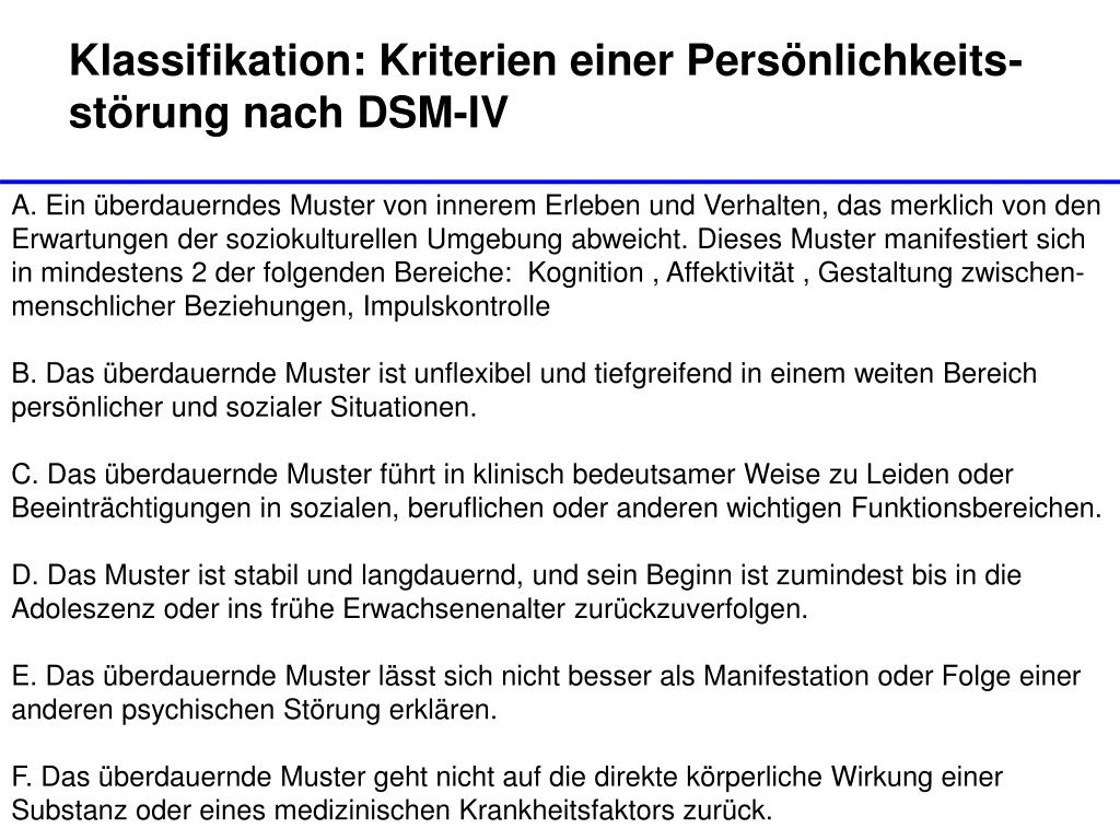 Klassifikation: Kriterien einer Persönlichkeits-störung nach DSM-IV A. Ein überdauerndes Muster von innerem Erleben und Verhalten, das merklich von den Erwartungen der soziokulturellen Umgebung abweicht. Dieses Muster manifestiert sich in mindestens 2 der folgenden Bereiche: Kognition , Affektivität , Gestaltung zwischen-menschlicher Beziehungen, Impulskontrolle B. Das überdauernde Muster ist unflexibel und tiefgreifend in einem weiten Bereich persönlicher und sozialer Situationen. C. Das überdauernde Muster führt in klinisch bedeutsamer Weise zu Leiden oder Beeinträchtigungen in sozialen, beruflichen oder anderen wichtigen Funktionsbereichen. D. Das Muster ist stabil und langdauernd, und sein Beginn ist zumindest bis in die Adoleszenz oder ins frühe Erwachsenenalter zurückzuverfolgen. E. Das überdauernde Muster lässt sich nicht besser als Manifestation oder Folge einer anderen psychischen Störung erklären. F. Das überdauernde Muster geht nicht auf die direkte körperliche Wirkung einer Substanz oder eines medizinischen Krankheitsfaktors zurück.