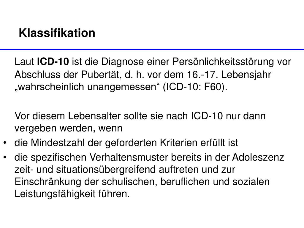Klassifikation • Laut ICD-10 ist die Diagnose einer Persönlichkeitsstörung vor Abschluss der Pubertät, d. h. vor dem 16.-17. Lebensjahr „wahrscheinlich unangemessen“ (ICD-10: F60). • Vor diesem Lebensalter sollte sie nach ICD-10 nur dann vergeben werden, wenn • die Mindestzahl der geforderten Kriterien erfüllt ist • die spezifischen Verhaltensmuster bereits in der Adoleszenz zeit- und situationsübergreifend auftreten und zur Einschränkung der schulischen, beruflichen und sozialen Leistungsfähigkeit führen.