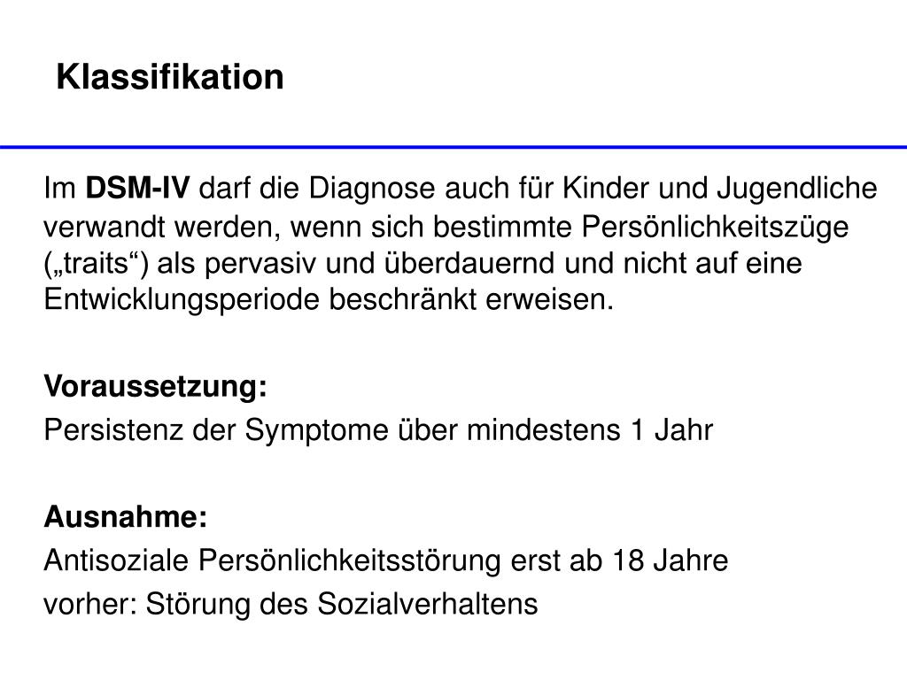 Klassifikation Im DSM-IV darf die Diagnose auch für Kinder und Jugendliche verwandt werden, wenn sich bestimmte Persönlichkeitszüge („traits“) als pervasiv und überdauernd und nicht auf eine Entwicklungsperiode beschränkt erweisen. Voraussetzung: Persistenz der Symptome über mindestens 1 Jahr Ausnahme: Antisoziale Persönlichkeitsstörung erst ab 18 Jahre vorher: Störung des Sozialverhaltens