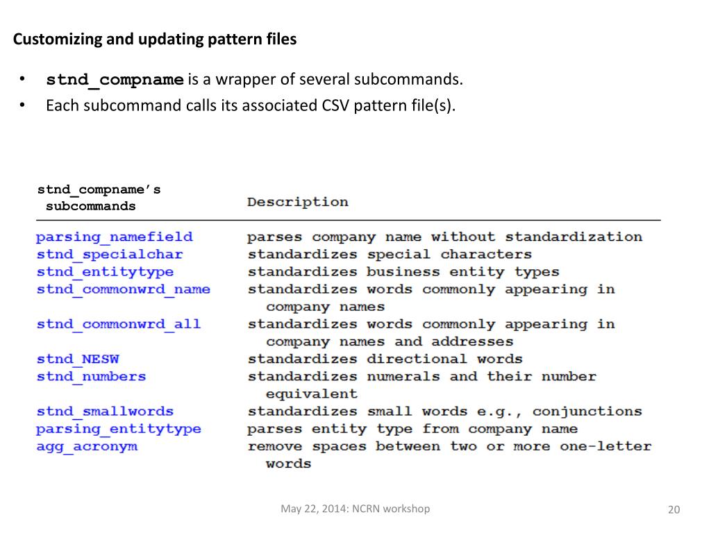 Customizing and updating pattern files • stnd_compname is a wrapper of several subcommands. • Each subcommand calls its associated CSV pattern file(s). stnd_compname’s subcommands May 22, 2014: NCRN workshop
