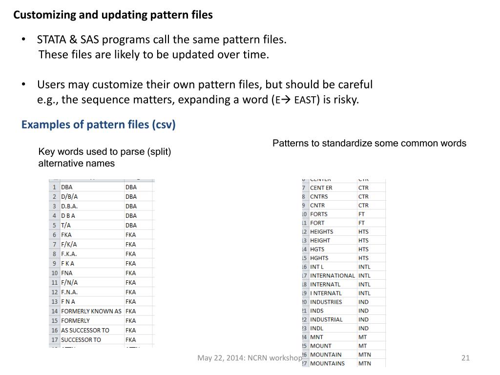Customizing and updating pattern files • STATA & SAS programs call the same pattern files. • These files are likely to be updated over time. • Users may customize their own pattern files, but should be careful e.g., the sequence matters, expanding a word (E EAST) is risky. Examples of pattern files (csv) Patterns to standardize some common words Key words used to parse (split) alternative names May 22, 2014: NCRN workshop