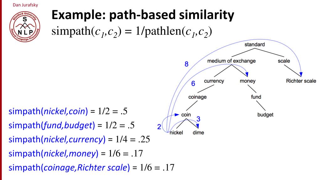 Example: path-based similaritysimpath(c1,c2) = 1/pathlen(c1,c2) simpath(nickel,coin) = 1/2 = .5 simpath(fund,budget) = 1/2 = .5 simpath(nickel,currency) = 1/4 = .25 simpath(nickel,money) = 1/6 = .17 simpath(coinage,Richter scale) = 1/6 = .17