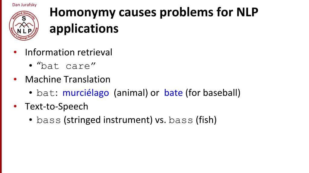 Homonymy causes problems for NLP applications • Information retrieval • “bat care” • Machine Translation • bat: murciélago (animal) or bate(for baseball) • Text-to-Speech • bass (stringed instrument) vs. bass (fish)