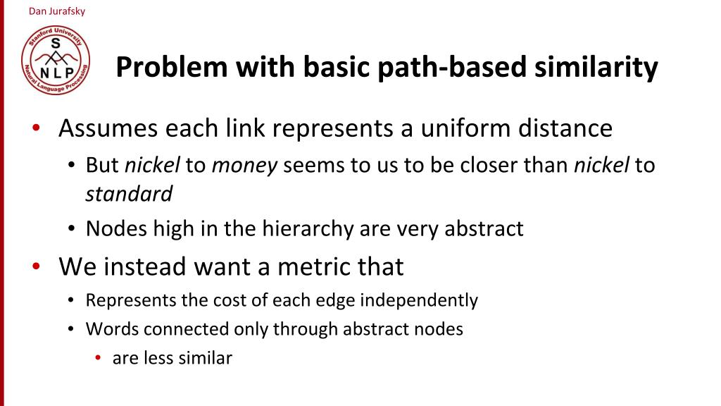Problem with basic path-based similarity • Assumes each link represents a uniform distance • But nickelto moneyseems to us to be closer than nickel to standard • Nodes high in the hierarchy are very abstract • We instead want a metric that • Represents the cost of each edge independently • Words connected only through abstract nodes • are less similar
