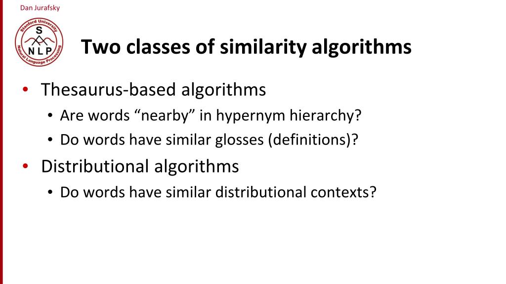 Two classes of similarity algorithms • Thesaurus-based algorithms • Are words “nearby” in hypernym hierarchy? • Do words have similar glosses (definitions)? • Distributional algorithms • Do words have similar distributional contexts?