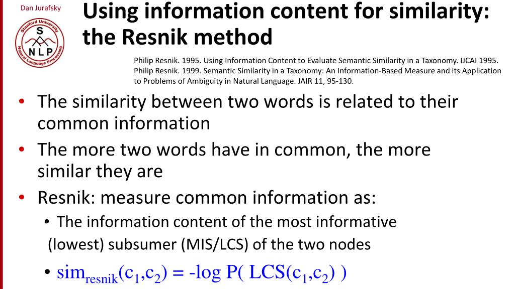 Using information content for similarity: the Resnik method Philip Resnik. 1995. Using Information Content to Evaluate Semantic Similarity in a Taxonomy. IJCAI 1995. Philip Resnik. 1999. Semantic Similarity in a Taxonomy: An Information-Based Measure and its Application to Problems of Ambiguity in Natural Language. JAIR 11, 95-130. • The similarity between two words is related to their common information • The more two words have in common, the more similar they are • Resnik: measure common information as: • The information content of the most informative (lowest) subsumer (MIS/LCS) of the two nodes • simresnik(c1,c2) = -log P( LCS(c1,c2) )