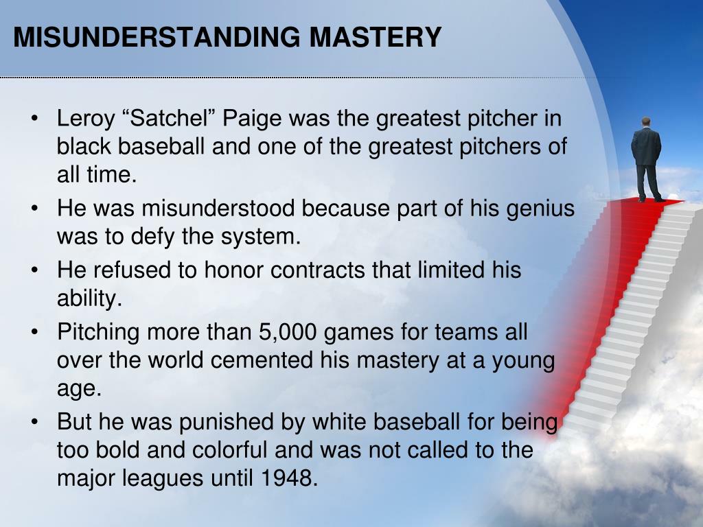 MISUNDERSTANDING MASTERY • Leroy “Satchel” Paige was the greatest pitcher in black baseball and one of the greatest pitchers of all time. • He was misunderstood because part of his genius was to defy the system. • He refused to honor contracts that limited his ability. • Pitching more than 5,000 games for teams all over the world cemented his mastery at a young age. • But he was punished by white baseball for being too bold and colorful and was not called to the major leagues until 1948.