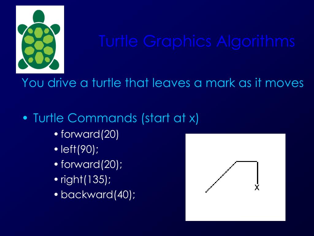 Turtle Graphics Algorithms • You drive a turtle that leaves a mark as it moves • Turtle Commands (start at x) • forward(20) • left(90); • forward(20); • right(135); • backward(40); x