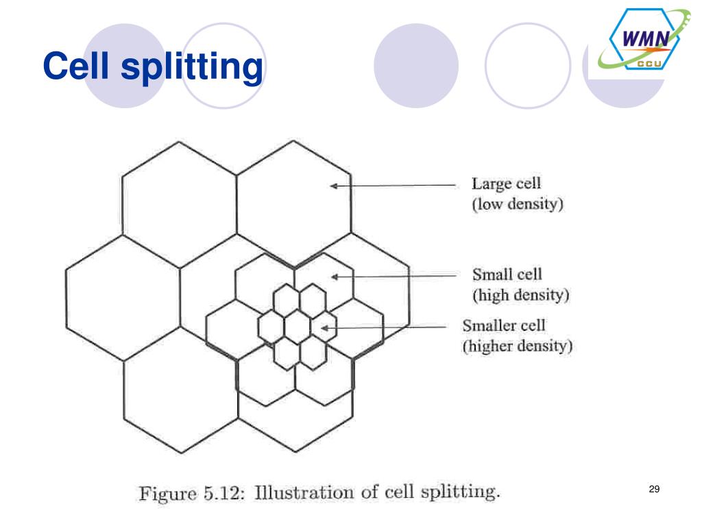 Cell Splitting • One way to cope with increased traffic is to split a cell into several smaller cells • As the coverage area of new split cells is smaller, the transmitting power levels are lower, and this help in reducing cochannel interference.