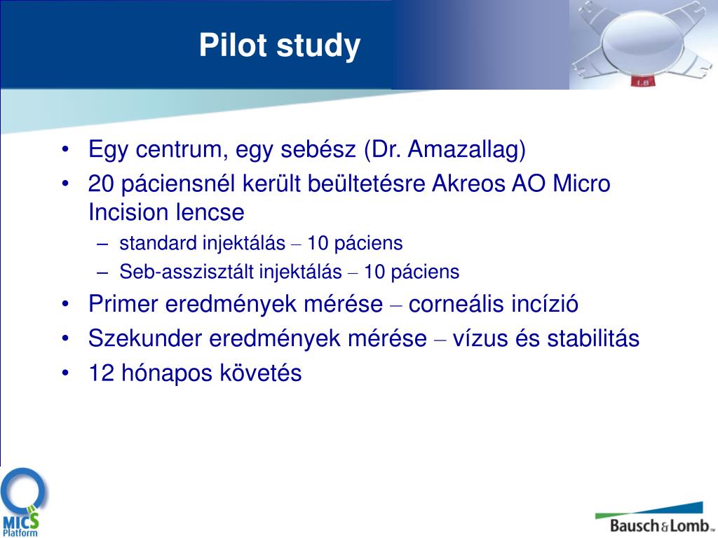 Pilot study • Egy centrum, egy sebész (Dr. Amazallag) • 20 páciensnél került beültetésre Akreos AO Micro Incision lencse • standard injektálás– 10 páciens • Seb-asszisztált injektálás– 10 páciens • Primer eredmények mérése–corneális incízió • Szekunder eredmények mérése–vízusés stabilitás • 12 hónapos követés