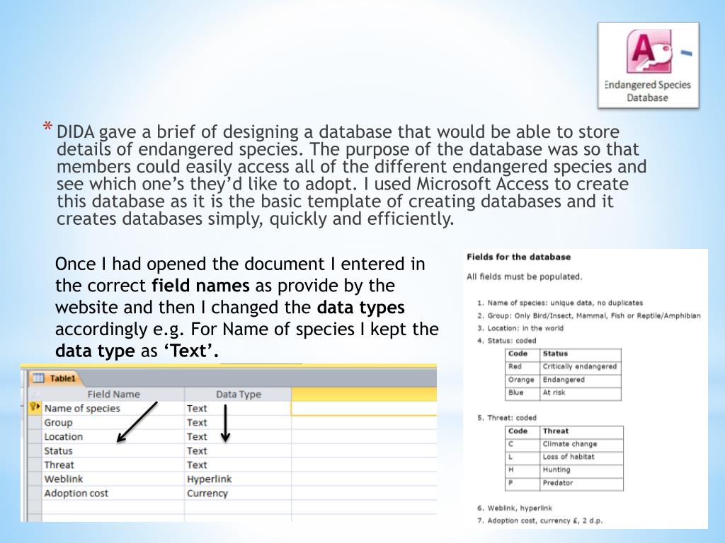 DIDA gave a brief of designing a database that would be able to store details of endangered species. The purpose of the database was so that members could easily access all of the different endangered species and see which one’s they’d like to adopt. I used Microsoft Access to create this database as it is the basic template of creating databases and it creates databases simply, quickly and efficiently. Once I had opened the document I entered in the correct field names as provide by the website and then I changed the data types accordingly e.g. For Name of species I kept the data type as ‘Text’.