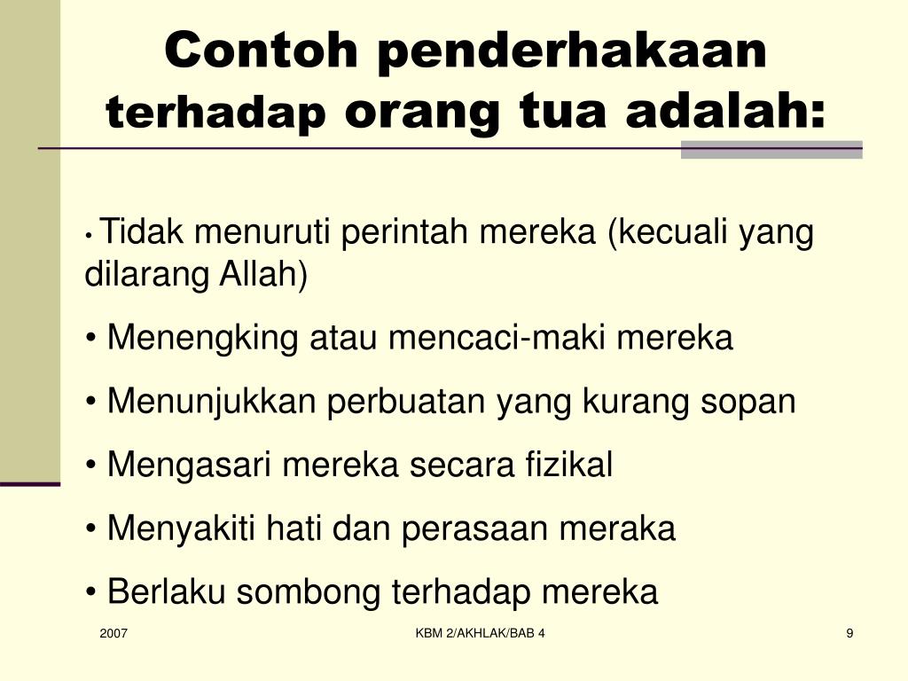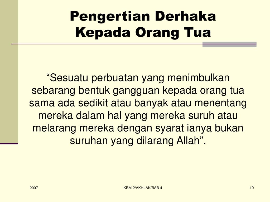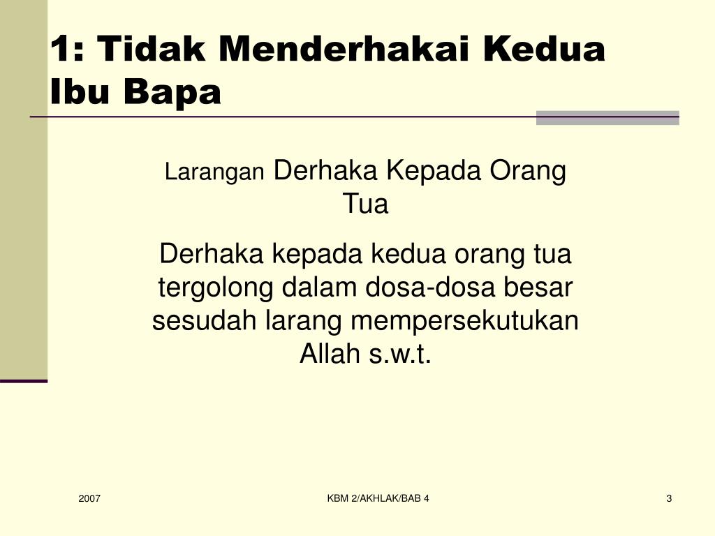 1: Tidak Menderhakai Kedua Ibu Bapa Larangan Derhaka Kepada Orang Tua Derhaka kepada kedua orang tua tergolong dalam dosa-dosa besar sesudah larang mempersekutukan Allah s.w.t. KBM 2/AKHLAK/BAB 4