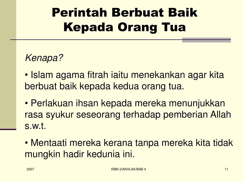 Perintah Berbuat Baik Kepada Orang Tua • Kenapa? • Islam agama fitrah iaitu menekankan agar kita berbuat baik kepada kedua orang tua. • Perlakuan ihsan kepada mereka menunjukkan rasa syukur seseorang terhadap pemberian Allah s.w.t. • Mentaati mereka kerana tanpa mereka kita tidak mungkin hadir kedunia ini. KBM 2/AKHLAK/BAB 4