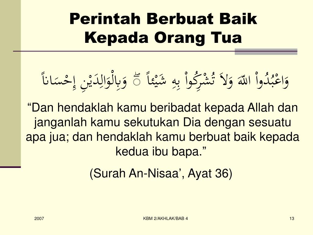 Perintah Berbuat Baik Kepada Orang Tua وَاعْبُدُواْ اللّهَ وَلاَ تُشْرِكُواْ بِهِ شَيْئاًۖوَبِالْوَالِدَيْنِ إِحْسَاناً “Dan hendaklah kamu beribadat kepada Allah dan janganlah kamu sekutukan Dia dengan sesuatu apa jua; dan hendaklah kamu berbuat baik kepada kedua ibu bapa.” (Surah An-Nisaa’, Ayat 36) KBM 2/AKHLAK/BAB 4