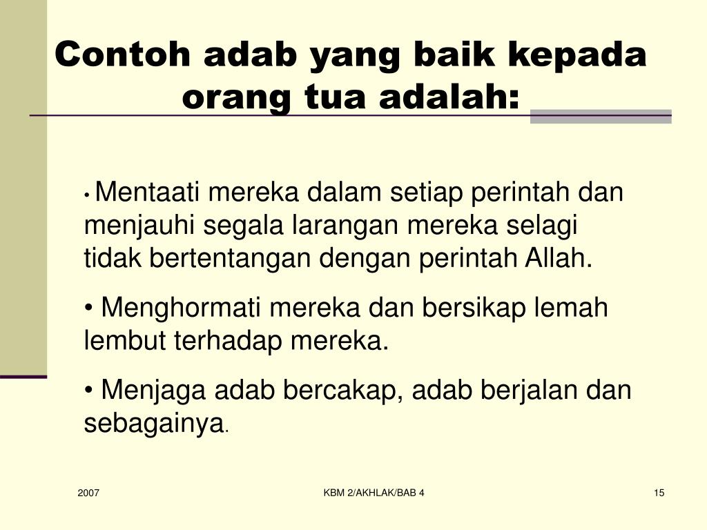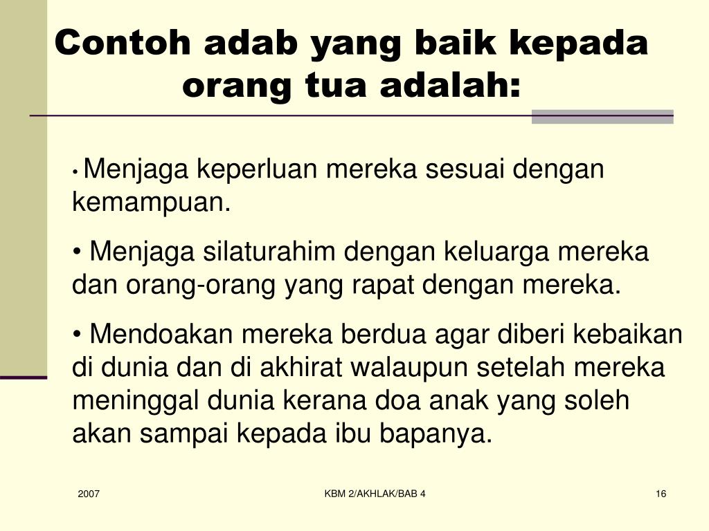 Contoh adab yang baik kepada orang tua adalah: • Menjaga keperluan mereka sesuai dengan kemampuan. • Menjaga silaturahim dengan keluarga mereka dan orang-orang yang rapat dengan mereka. • Mendoakan mereka berdua agar diberi kebaikan di dunia dan di akhirat walaupun setelah mereka meninggal dunia kerana doa anak yang soleh akan sampai kepada ibu bapanya. KBM 2/AKHLAK/BAB 4