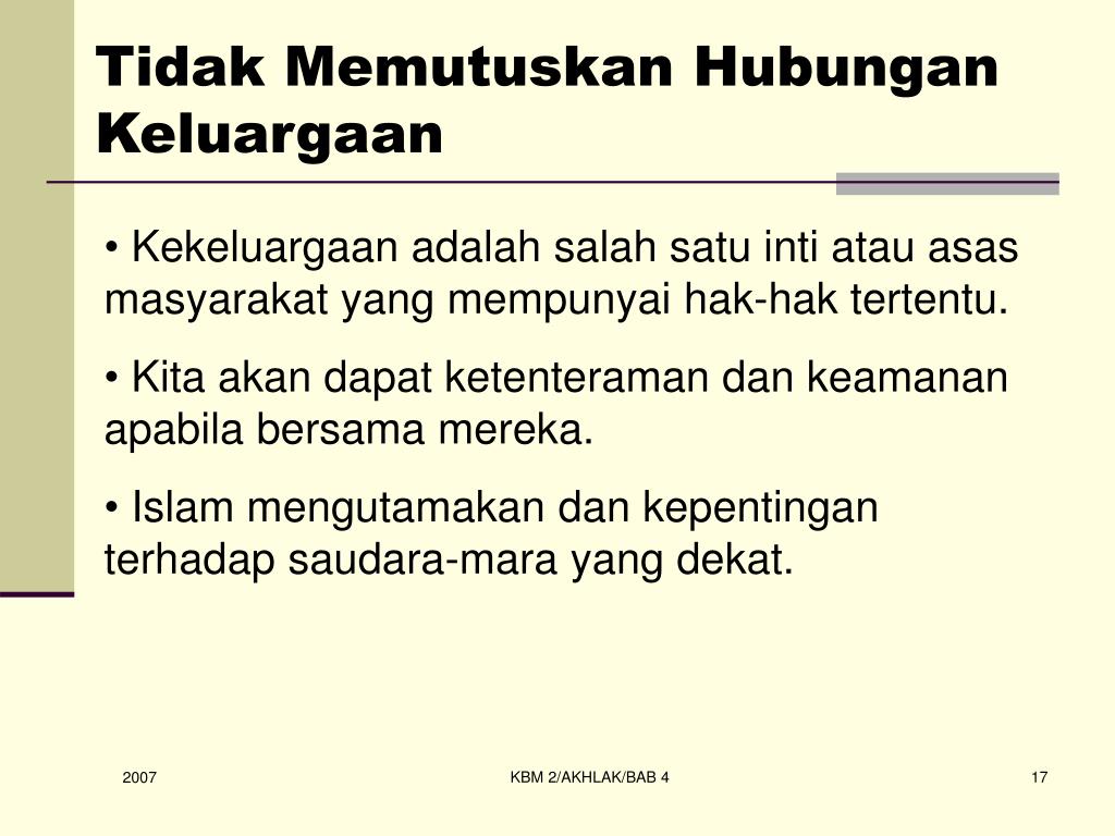 Tidak Memutuskan Hubungan Keluargaan • Kekeluargaan adalah salah satu inti atau asas masyarakat yang mempunyai hak-hak tertentu. • Kita akan dapat ketenteraman dan keamanan apabila bersama mereka. • Islam mengutamakan dan kepentingan terhadap saudara-mara yang dekat. KBM 2/AKHLAK/BAB 4