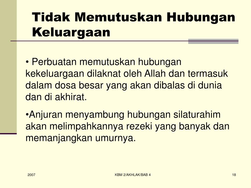 Tidak Memutuskan Hubungan Keluargaan • Perbuatan memutuskan hubungan kekeluargaan dilaknat oleh Allah dan termasuk dalam dosa besar yang akan dibalas di dunia dan di akhirat. • Anjuran menyambung hubungan silaturahim akan melimpahkannya rezeki yang banyak dan memanjangkan umurnya. KBM 2/AKHLAK/BAB 4