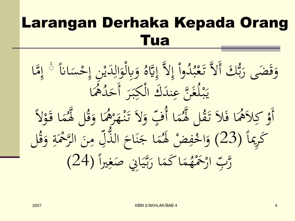 Larangan Derhaka Kepada Orang Tua وَقَضَى رَبُّكَ أَلاَّ تَعْبُدُواْ إِلاَّ إِيَّاهُ وَبِالْوَالِدَيْنِ إِحْسَاناًۚإِمَّا يَبْلُغَنَّ عِندَكَ الْكِبَرَ أَحَدُهُمَا أَوْ كِلاَهُمَا فَلاَ تَقُل لَّهُمَا أُفٍّ وَلاَ تَنْهَرْهُمَا وَقُل لَّهُمَا قَوْلاً كَرِيماً (23) وَاخْفِضْ لَهُمَا جَنَاحَ الذُّلِّ مِنَ الرَّحْمَةِ وَقُل رَّبِّ ارْحَمْهُمَا كَمَا رَبَّيَانِي صَغِيراً (24) KBM 2/AKHLAK/BAB 4