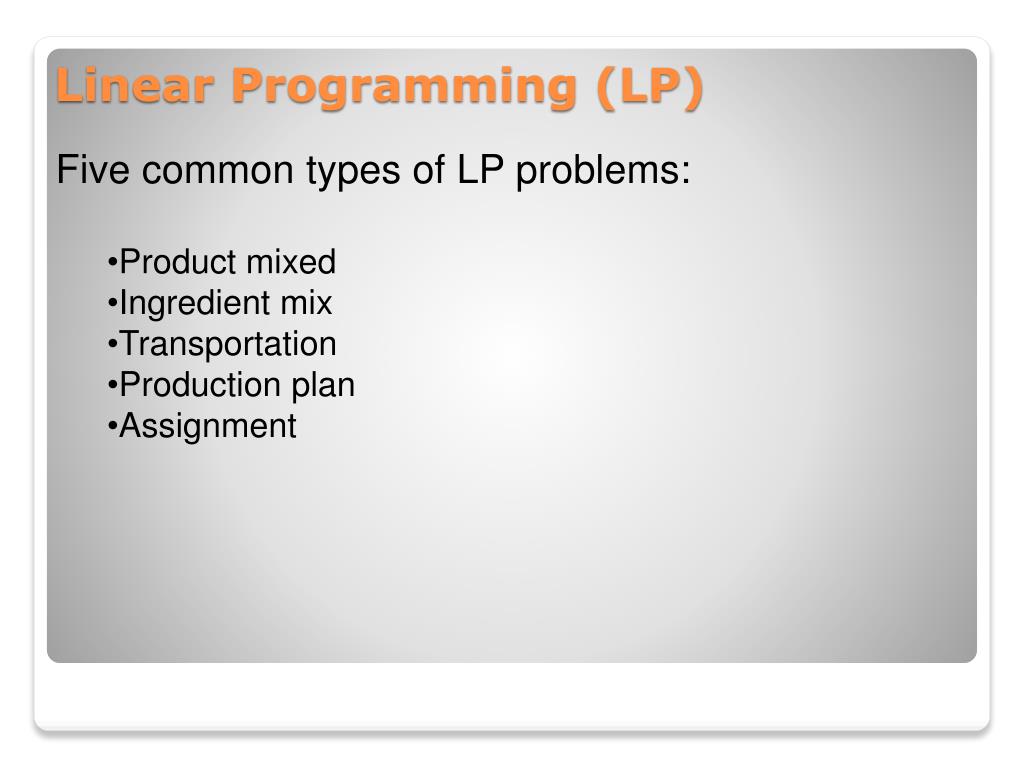 Five common types of LP problems: • Product mixed • Ingredient mix • Transportation • Production plan • Assignment Linear Programming (LP)