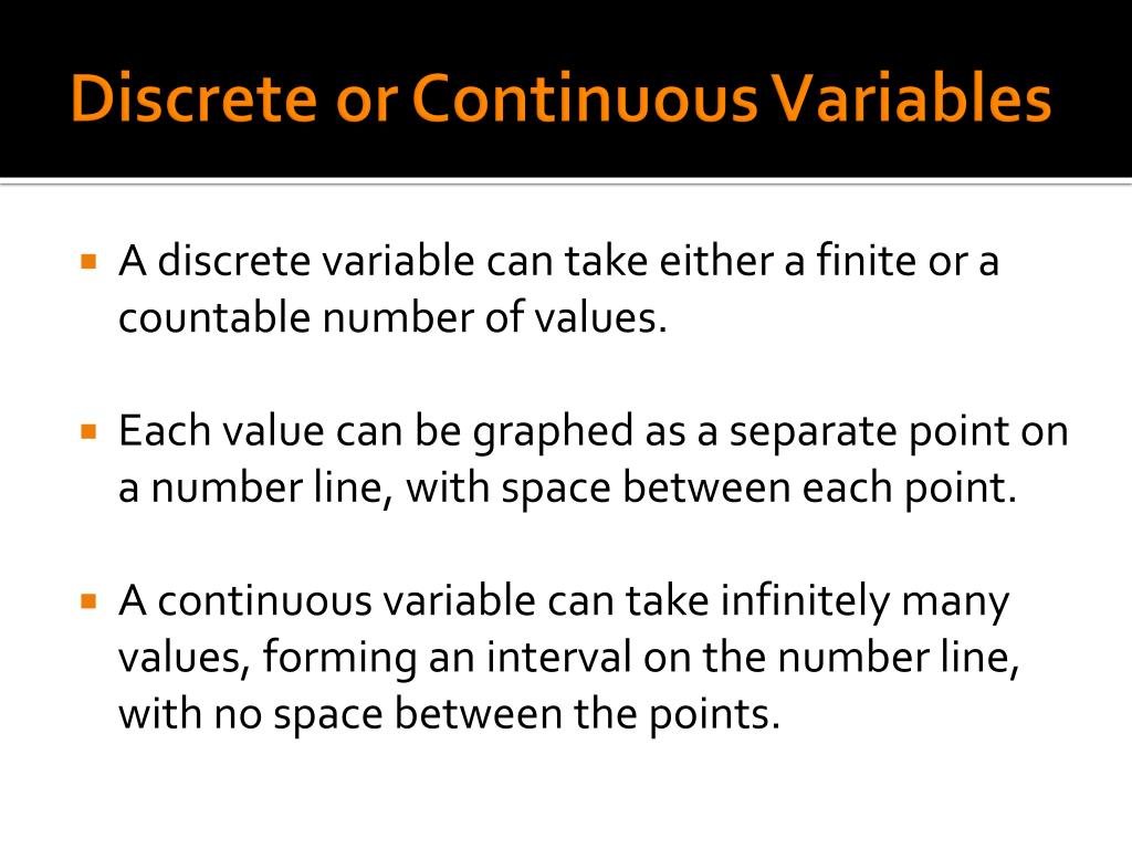 Discrete or Continuous Variables • A discrete variable can take either a finite or a countable number of values. • Each value can be graphed as a separate point on a number line, with space between each point. • A continuous variable can take infinitely many values, forming an interval on the number line, with no space between the points.
