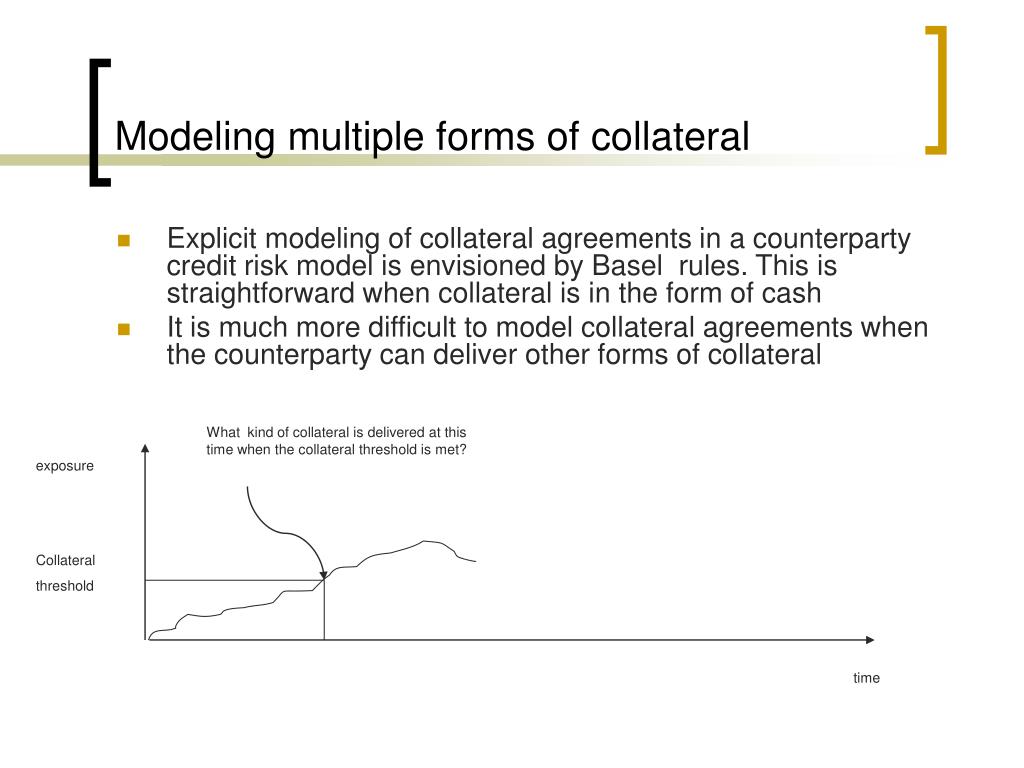 Modeling multiple forms of collateral • Explicit modeling of collateral agreements in a counterparty credit risk model is envisioned by Basel rules. This is straightforward when collateral is in the form of cash • It is much more difficult to model collateral agreements when the counterparty can deliver other forms of collateral What kind of collateral is delivered at this time when the collateral threshold is met? exposure Collateral threshold time