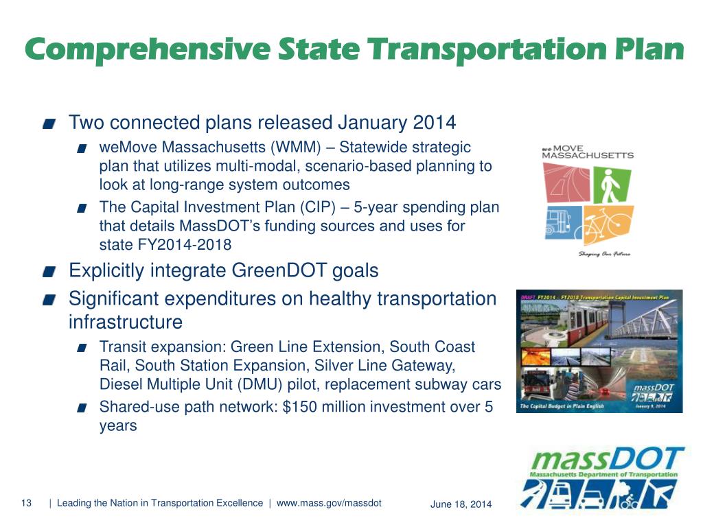 Comprehensive State Transportation Plan • Two connected plans released January 2014 • weMove Massachusetts (WMM) – Statewide strategic plan that utilizes multi-modal, scenario-based planning to look at long-range system outcomes • The Capital Investment Plan (CIP) – 5-year spending plan that details MassDOT’s funding sources and uses for state FY2014-2018 • Explicitly integrate GreenDOT goals • Significant expenditures on healthy transportation infrastructure • Transit expansion: Green Line Extension, South Coast Rail, South Station Expansion, Silver Line Gateway, Diesel Multiple Unit (DMU) pilot, replacement subway cars • Shared-use path network: $150 million investment over 5 years | Leading the Nation in Transportation Excellence | www.mass.gov/massdot