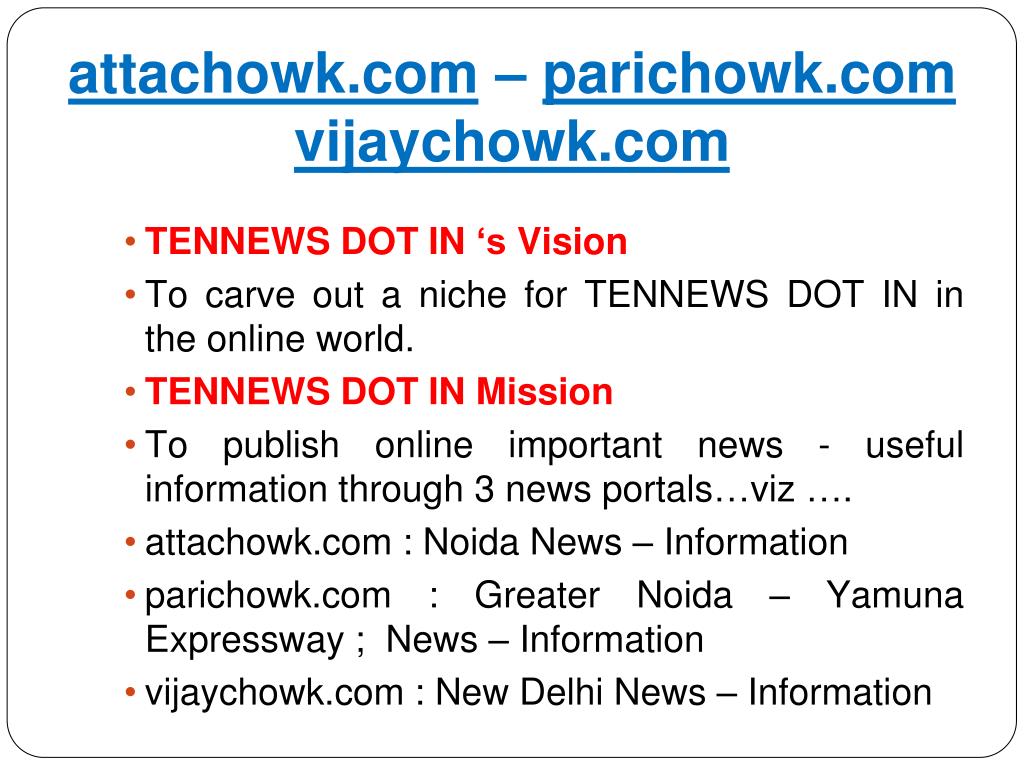 attachowk.com – parichowk.comvijaychowk.com • TENNEWS DOT IN ‘s Vision • To carve out a niche for TENNEWS DOT IN in the online world. • TENNEWS DOT IN Mission • To publish online important news - useful information through 3 news portals…viz …. • attachowk.com : Noida News – Information • parichowk.com : Greater Noida – Yamuna Expressway ; News – Information • vijaychowk.com : New Delhi News – Information