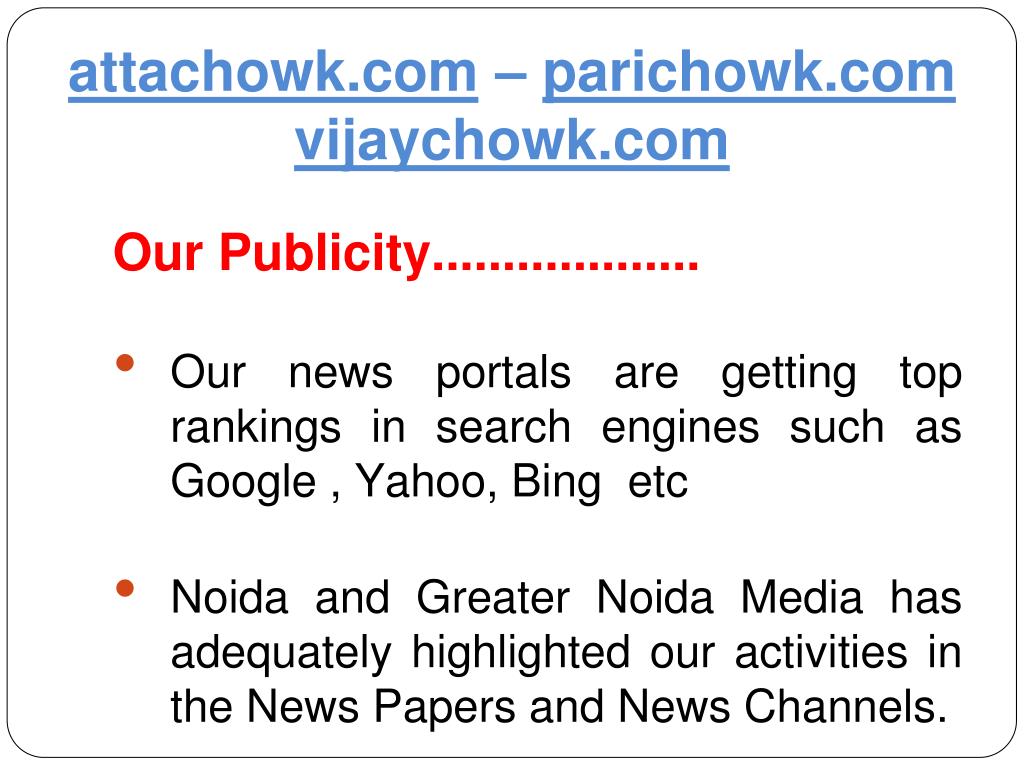 attachowk.com – parichowk.comvijaychowk.com Our Publicity................... • Our news portals are getting top rankings in search engines such as Google , Yahoo, Bing etc • Noida and Greater Noida Media has adequately highlighted our activities in the News Papers and News Channels.