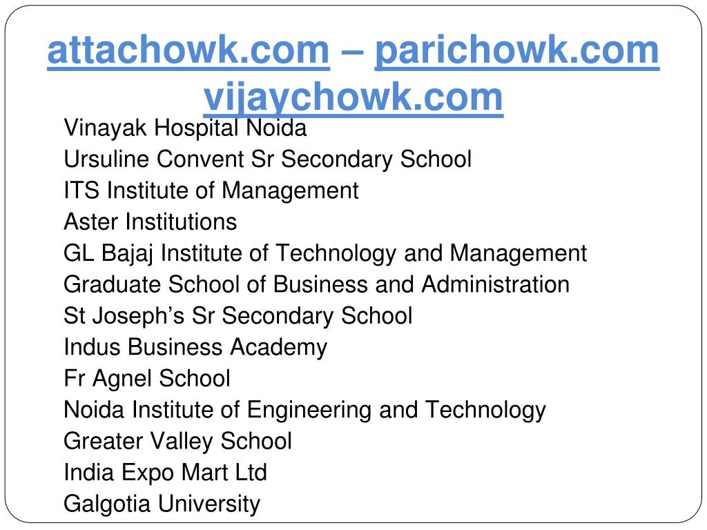 attachowk.com – parichowk.comvijaychowk.com Vinayak Hospital Noida Ursuline Convent Sr Secondary School ITS Institute of Management Aster Institutions GL Bajaj Institute of Technology and Management Graduate School of Business and Administration St Joseph’s Sr Secondary School Indus Business Academy Fr Agnel School Noida Institute of Engineering and Technology Greater Valley School India Expo Mart Ltd Galgotia University