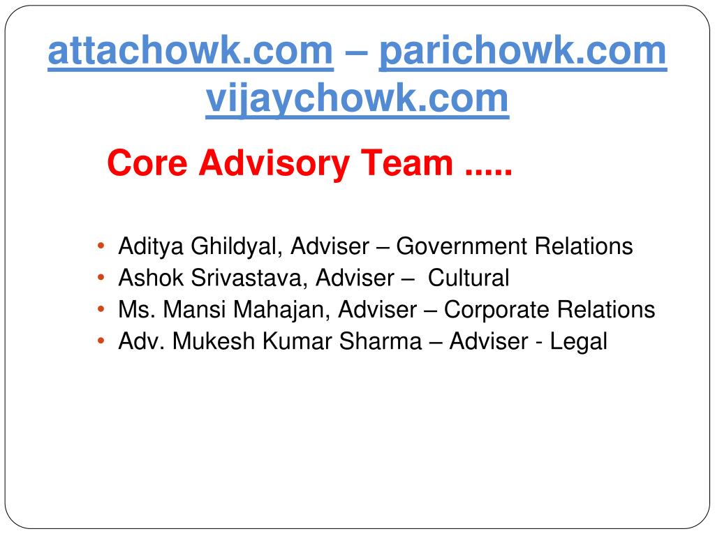 attachowk.com – parichowk.comvijaychowk.com Core Advisory Team..... • Aditya Ghildyal, Adviser – Government Relations • Ashok Srivastava, Adviser – Cultural • Ms. Mansi Mahajan, Adviser – Corporate Relations • Adv. Mukesh Kumar Sharma – Adviser - Legal