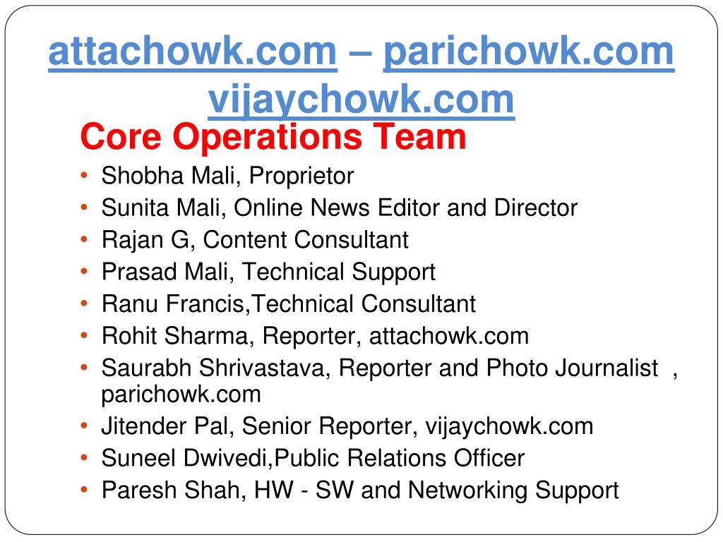 attachowk.com – parichowk.comvijaychowk.com Core Operations Team • Shobha Mali, Proprietor • Sunita Mali, Online News Editor and Director • Rajan G, Content Consultant • Prasad Mali, Technical Support • Ranu Francis,Technical Consultant • Rohit Sharma, Reporter, attachowk.com • Saurabh Shrivastava, Reporter and Photo Journalist , parichowk.com • Jitender Pal, Senior Reporter, vijaychowk.com • Suneel Dwivedi,Public Relations Officer • Paresh Shah, HW - SW and Networking Support