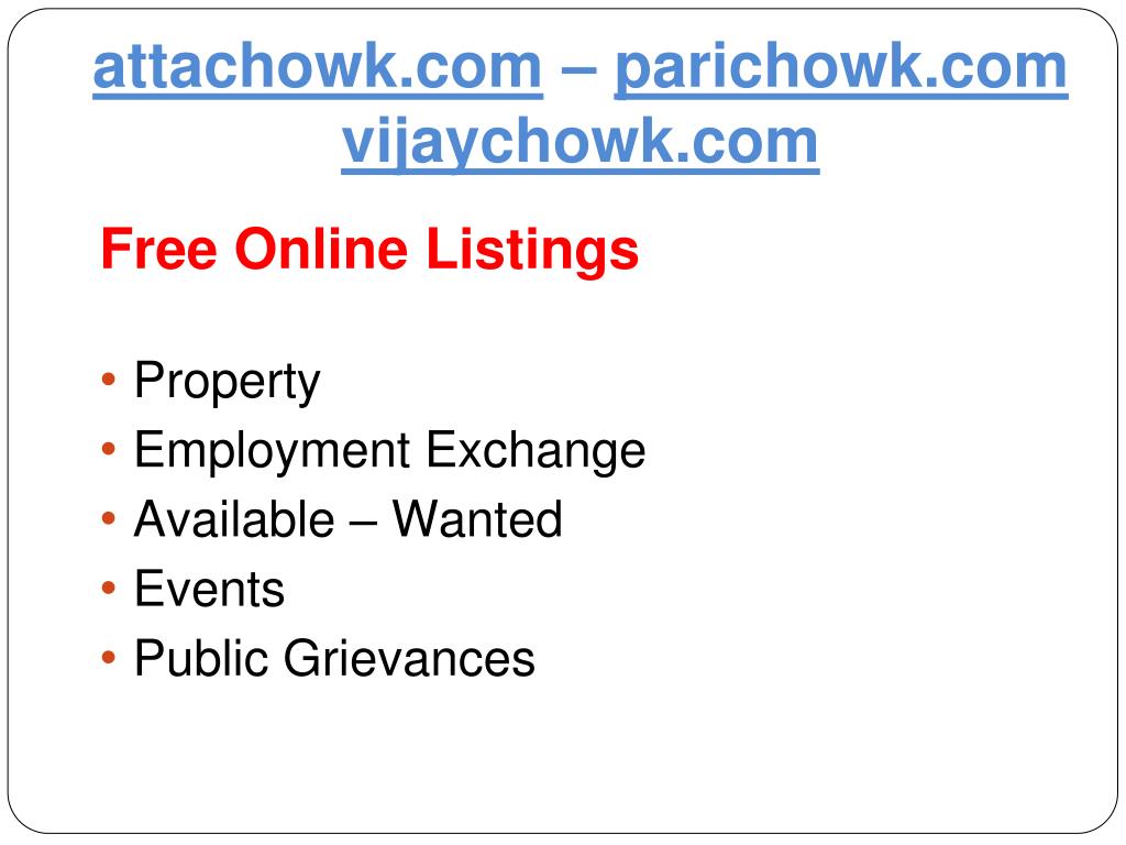 attachowk.com – parichowk.comvijaychowk.com Free Online Listings • Property • Employment Exchange • Available – Wanted • Events • Public Grievances