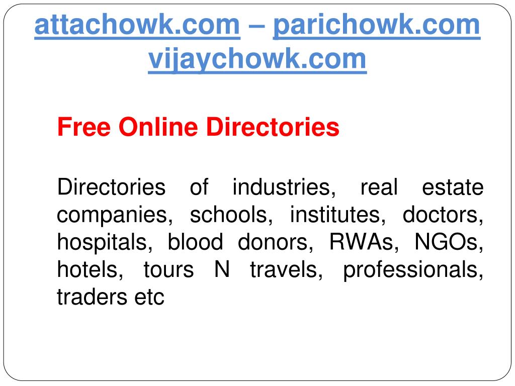 attachowk.com – parichowk.comvijaychowk.com Free Online Directories Directories of industries, real estate companies, schools, institutes, doctors, hospitals, blood donors, RWAs, NGOs, hotels, tours N travels, professionals, traders etc