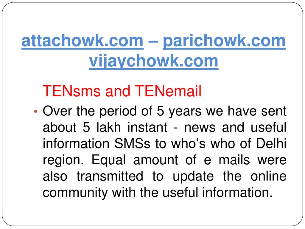 attachowk.com – parichowk.comvijaychowk.com TENsmsand TENemail • Over the period of 5 years we have sent about 5 lakh instant - news and useful information SMSs to who’s who of Delhi region. Equal amount of e mails were also transmitted to update the online community with the useful information.