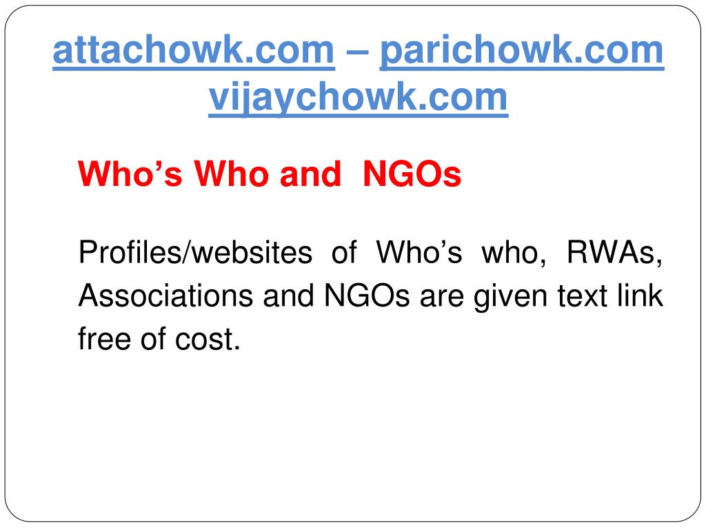 attachowk.com – parichowk.comvijaychowk.com Who’s Who and NGOs Profiles/websites of Who’s who, RWAs, Associations and NGOs are given text link free of cost.