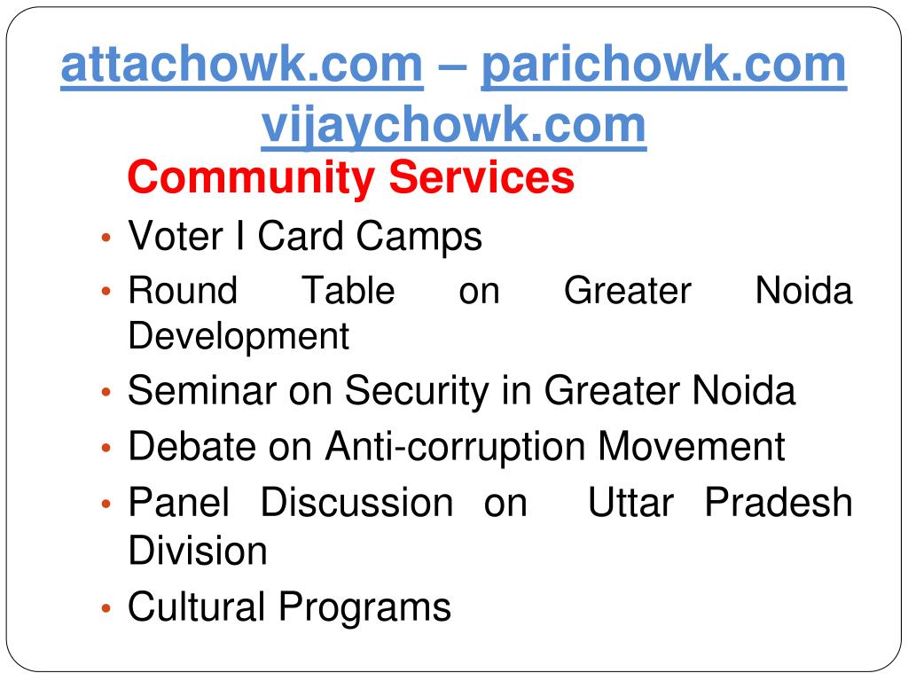 attachowk.com – parichowk.comvijaychowk.com Community Services • Voter I Card Camps • Round Table on Greater Noida Development • Seminar on Security in Greater Noida • Debate on Anti-corruption Movement • Panel Discussion on Uttar Pradesh Division • Cultural Programs