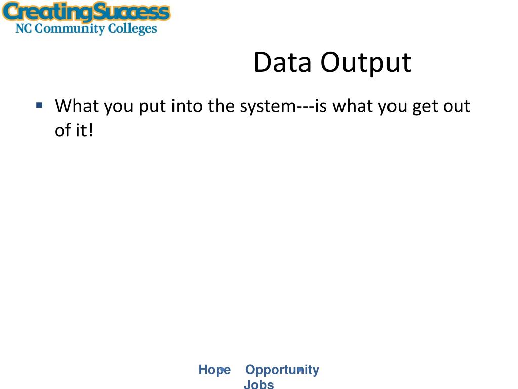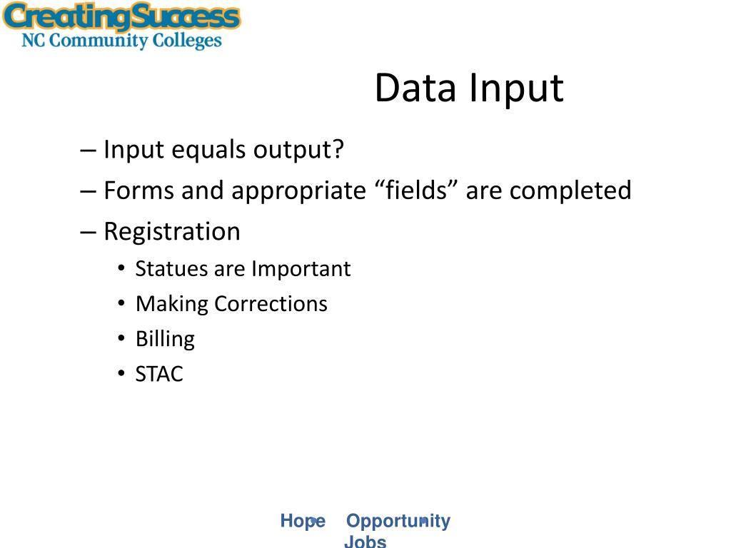 Data Input • Input equals output? • Forms and appropriate “fields” are completed • Registration • Statues are Important • Making Corrections • Billing • STAC