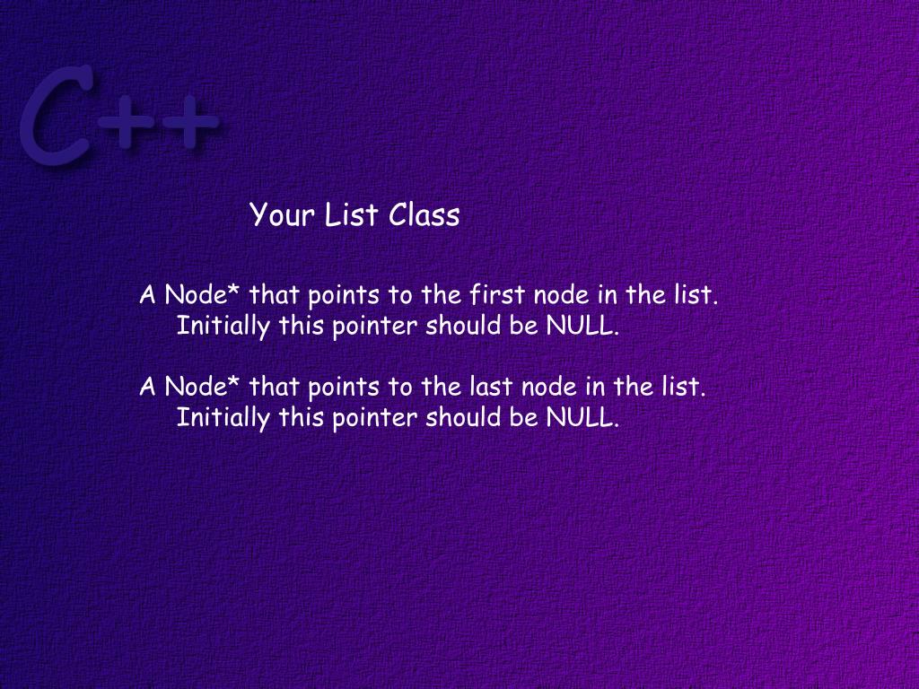 Your List Class A Node* that points to the first node in the list. Initially this pointer should be NULL. A Node* that points to the last node in the list. Initially this pointer should be NULL.