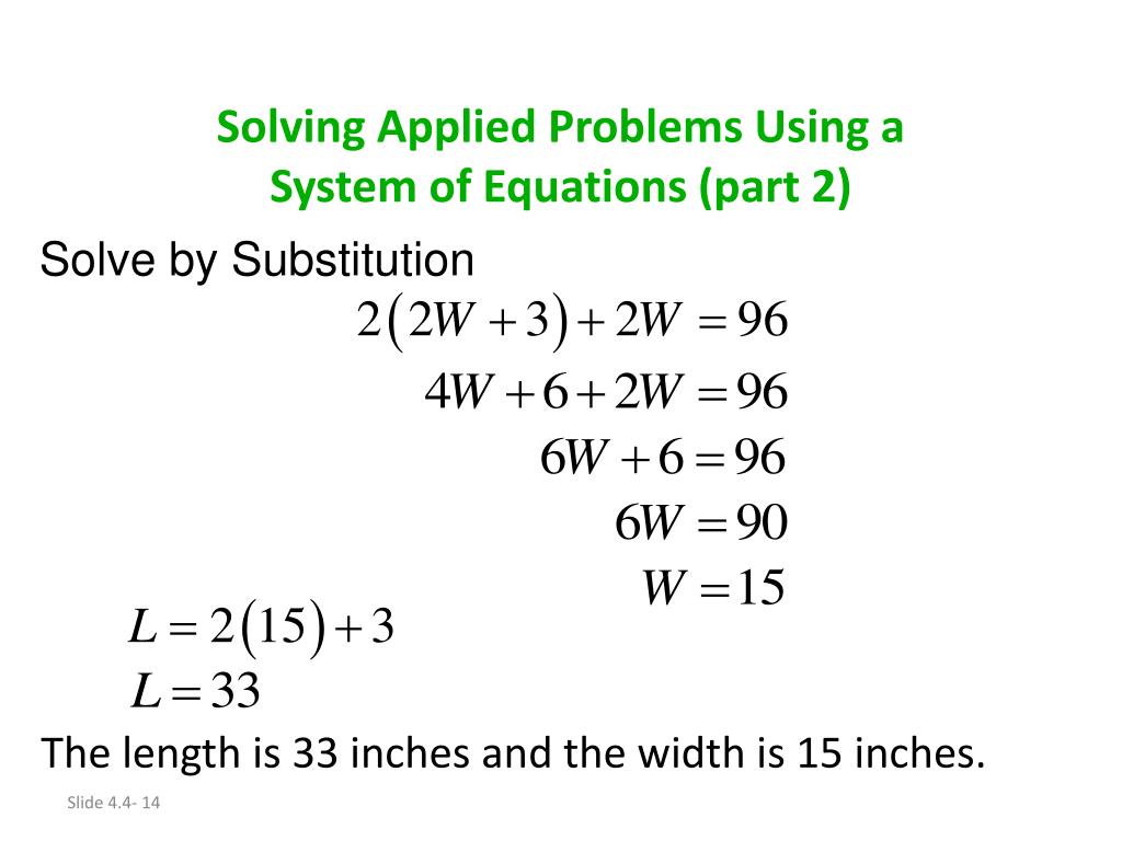 Solving Applied Problems Using a System of Equations (part 2) Solve by Substitution The length is 33 inches and the width is 15 inches.