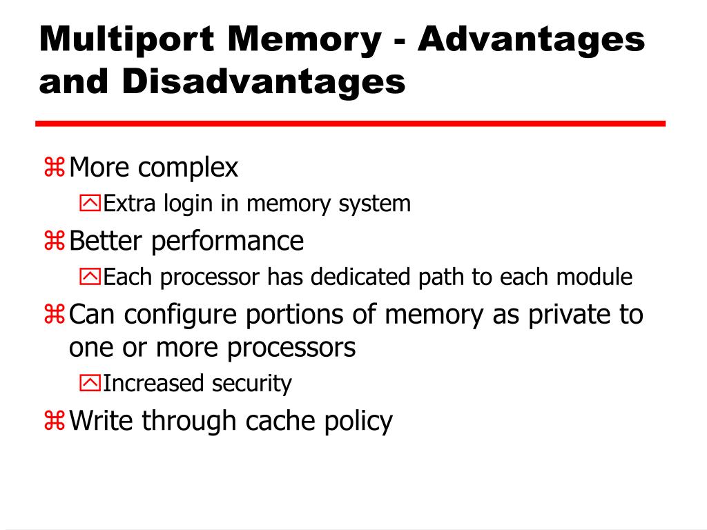 Multiport Memory - Advantages and Disadvantages • More complex • Extra login in memory system • Better performance • Each processor has dedicated path to each module • Can configure portions of memory as private to one or more processors • Increased security • Write through cache policy