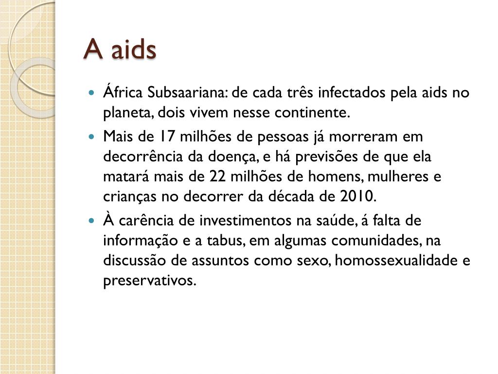 A aids • África Subsaariana: de cada três infectados pela aids no planeta, dois vivem nesse continente. • Mais de 17 milhões de pessoas já morreram em decorrência da doença, e há previsões de que ela matará mais de 22 milhões de homens, mulheres e crianças no decorrer da década de 2010. • À carência de investimentos na saúde, á falta de informação e a tabus, em algumas comunidades, na discussão de assuntos como sexo, homossexualidade e preservativos.
