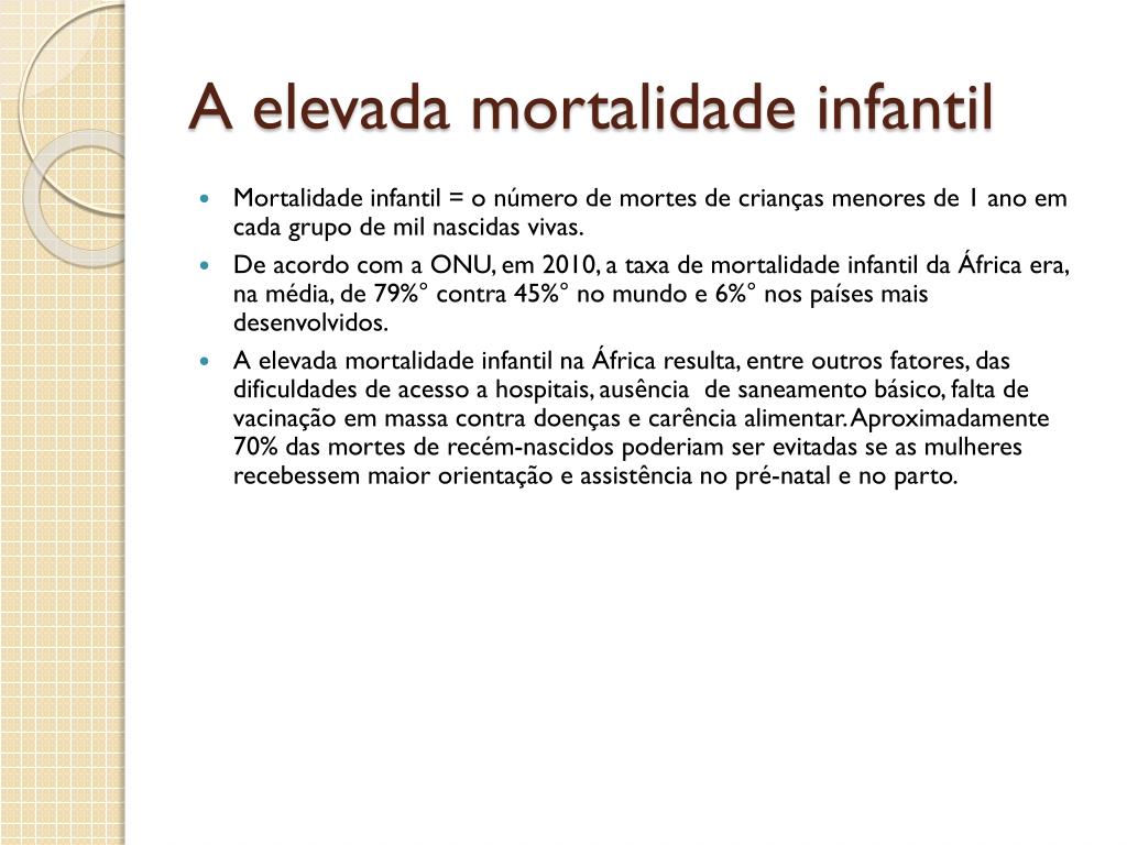 A elevada mortalidade infantil • Mortalidade infantil = o número de mortes de crianças menores de 1 ano em cada grupo de mil nascidas vivas. • De acordo com a ONU, em 2010, a taxa de mortalidade infantil da África era, na média, de 79%° contra 45%° no mundo e 6%° nos países mais desenvolvidos. • A elevada mortalidade infantil na África resulta, entre outros fatores, das dificuldades de acesso a hospitais, ausência de saneamento básico, falta de vacinação em massa contra doenças e carência alimentar. Aproximadamente 70% das mortes de recém-nascidos poderiam ser evitadas se as mulheres recebessem maior orientação e assistência no pré-natal e no parto.
