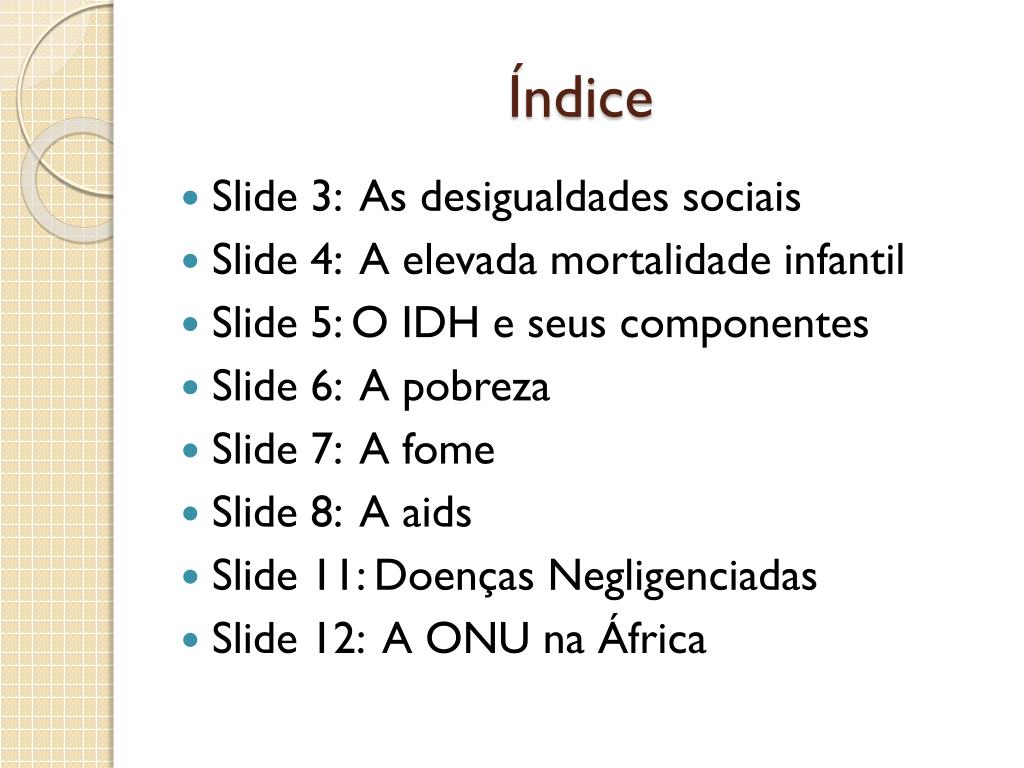 Índice • Slide 3: As desigualdades sociais • Slide 4: A elevada mortalidade infantil • Slide 5: O IDH e seus componentes • Slide 6: A pobreza • Slide 7: A fome • Slide 8: A aids • Slide 11: Doenças Negligenciadas • Slide 12: A ONU na África