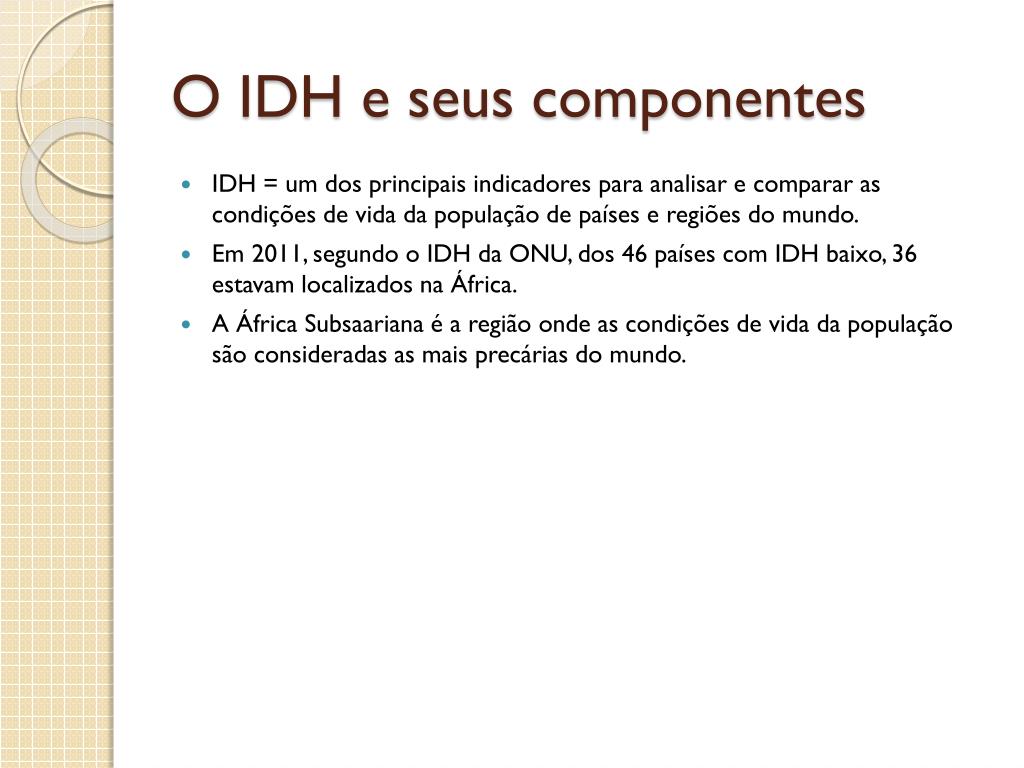 O IDH e seus componentes • IDH = um dos principais indicadores para analisar e comparar as condições de vida da população de países e regiões do mundo. • Em 2011, segundo o IDH da ONU, dos 46 países com IDH baixo, 36 estavam localizados na África. • A África Subsaariana é a região onde as condições de vida da população são consideradas as mais precárias do mundo.