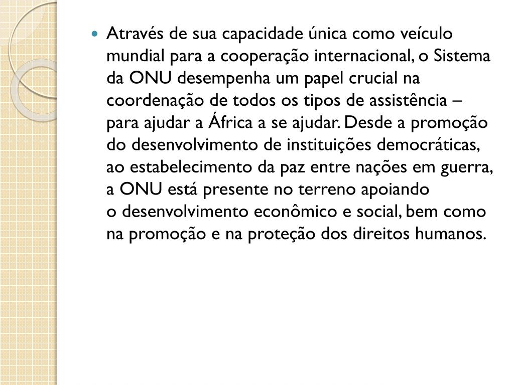 Através de sua capacidade única como veículo mundial para a cooperação internacional, o Sistema da ONU desempenha um papel crucial na coordenação de todos os tipos de assistência – para ajudar a África a se ajudar. Desde a promoção do desenvolvimento de instituições democráticas, ao estabelecimento da paz entre nações em guerra, a ONU está presente no terreno apoiando o desenvolvimento econômico e social, bem como na promoção e na proteção dos direitos humanos.